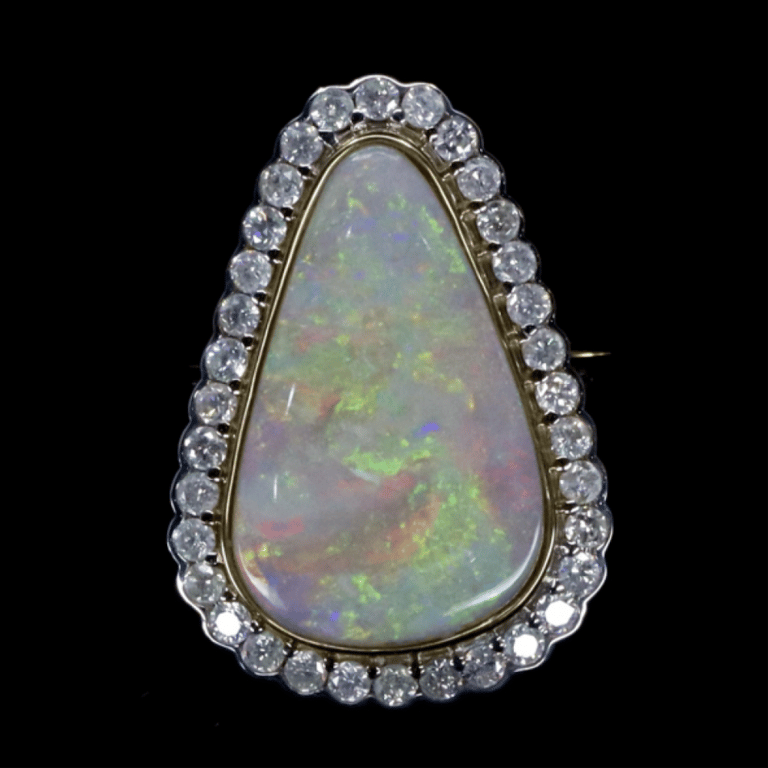 14K YELLOW GOLD, 4.08CT AUSTRALIAN ANDAMOOKA OPAL AND DIAMOND, HALO RING. The Centre Features, One Pear Cabochon Cut, Australian Andamooka Opal (4.08Ct, Green-Violet-Yellow-Blue-Pink Strong Colour Play), Bezel Set. Surrounding The Centre In A Halo Are, 34 Round Brilliant Cut, Diamonds (0.56Ct Tdw, J-K Colour, Si1-Si2 Clarity), Micro-Claw Set In White Gold. Ring Size L 1/2. Valuations Provided by an Independent Third-Party Professional Not Directly Associated With Lloyds Auctions at AUD $$11,490.00This valuation has been conducted by an independent third-party professional. The valuation amount is an assessment by the issuing valuer and does not reflect the auction value of the item. Any inquiries regarding the valuation should be directed to the issuing valuer (refer to contact details on the certificate), as Lloyds Auctions has no affiliation or influence over the valuation, the valuer, or the stated amount. Condition: Good - Refer Images 0645839+1441