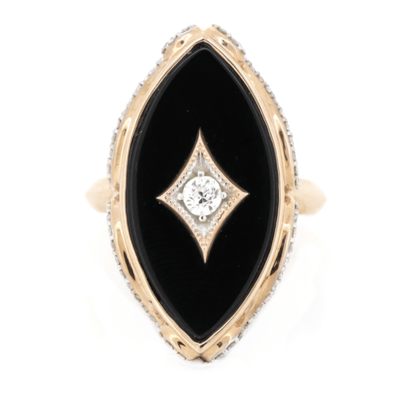 14K ROSE GOLD, BLACK ONYX AND DIAMOND, ART DECO INSPIRED RING. The Centre Features, One Old Cut, Diamond (0.15Ct, J-K Colour, Si1-Si2 Clarity), Bead Set. Surrounding The Centre Is One Marquise Cut, Black, Onyx (4.69Ct, Opaque), Bezel Set. Embellishing The Design Are, 104 Round Brilliant Cut, Diamonds (0.42Ct Tdw, I-K Colour, Si1-P1 Clarity), Claw Set. Ring Size P. Valuations Provided by an Independent Third-Party Professional Not Directly Associated With Lloyds Auctions at AUD $$12,250.00This valuation has been conducted by an independent third-party professional. The valuation amount is an assessment by the issuing valuer and does not reflect the auction value of the item. Any inquiries regarding the valuation should be directed to the issuing valuer (refer to contact details on the certificate), as Lloyds Auctions has no affiliation or influence over the valuation, the valuer, or the stated amount. Condition: Good - Refer Images 0645839+1500