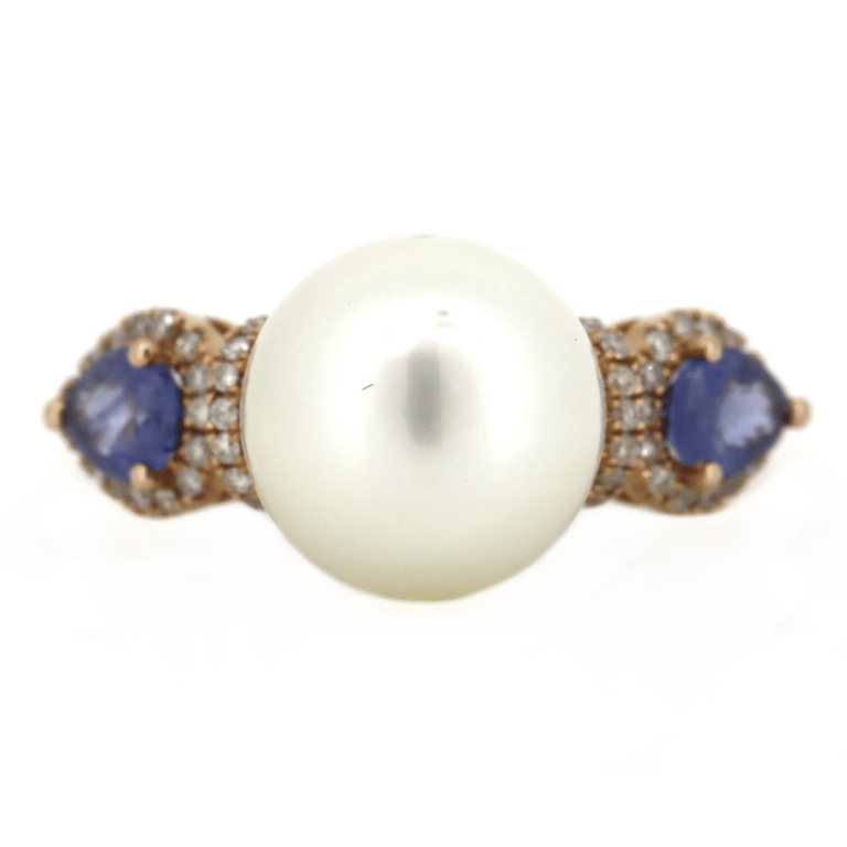 14K ROSE GOLD, WHITE CULTURED SOUTH SEA PEARL, BLUE SAPPHIRE AND DIAMOND, STATEMENT RING. The Centre Features, One Near Round, White With Silver Overtones, Cultured South Sea Pearl (10.32Mm Size, Very Slightly Blemished, Medium Lustre). Decorating The Shoulders Are, 2 Pear Cut, Royal Blue, Sapphires (0.83.Ct Tsw, Eye Clean Clarity), Claw Set. Embellishing The Design Are, 54 Round Brilliant Cut, Diamonds (0.20Ct Tdw, H-J Colour, Si2-I2 Clarity), Micro-Claw Set. Ring Size M. Valuations Provided by an Independent Third-Party Professional Not Directly Associated With Lloyds Auctions at AUD $$8,590.00This valuation has been conducted by an independent third-party professional. The valuation amount is an assessment by the issuing valuer and does not reflect the auction value of the item. Any inquiries regarding the valuation should be directed to the issuing valuer (refer to contact details on the certificate), as Lloyds Auctions has no affiliation or influence over the valuation, the valuer, or the stated amount. Condition: Good - Refer Images 0645839+1431