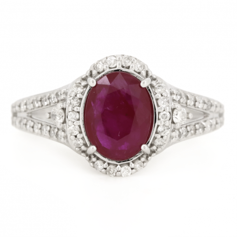 14K WHITE GOLD, RUBY AND DIAMOND, HALO RING. The Centre Features, One Oval Faceted Cut, Pinkish-Red, Ruby (1.15Ct, Included, Enhanced), Claw Set. Surrounding The Centre In A Halo And Decorating The Split Band Are, 52 Round Brilliant Cut, Diamonds (0.30Ct Tdw, I-K Colour, P1-P2 Clarity), Claw Set. Ring Size M 1/2. Valuations Provided by an Independent Third-Party Professional Not Directly Associated With Lloyds Auctions at AUD $$7,280.00This valuation has been conducted by an independent third-party professional. The valuation amount is an assessment by the issuing valuer and does not reflect the auction value of the item. Any inquiries regarding the valuation should be directed to the issuing valuer (refer to contact details on the certificate), as Lloyds Auctions has no affiliation or influence over the valuation, the valuer, or the stated amount. Condition: Good - Refer Images 0645839+1460