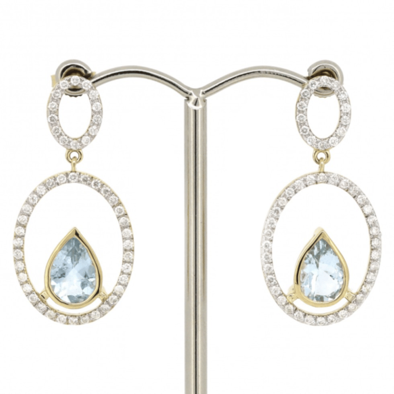 14K YELLOW GOLD, AQUAMARINE AND DIAMOND, DOUBLE HOOP DROP EARRINGS. The Centre Features, 2 Pear Faceted Cut, Medium Blue, Aquamarines (2.11Ct Tsw, Slightly Included), Bezel Set. Accompanying The Centre Are, 96 Round Brilliant Cut, Diamonds (0.84Ct Tdw, I-K Colour, Si2-P2 Clarity), Claw Set. The Earrings Have Post Backs, With 14K Yellow Gold Butterfly Clasps. Valuations Provided by an Independent Third-Party Professional Not Directly Associated With Lloyds Auctions at AUD $$11,210.00This valuation has been conducted by an independent third-party professional. The valuation amount is an assessment by the issuing valuer and does not reflect the auction value of the item. Any inquiries regarding the valuation should be directed to the issuing valuer (refer to contact details on the certificate), as Lloyds Auctions has no affiliation or influence over the valuation, the valuer, or the stated amount. Condition: Good - Refer Images 0645839+1407