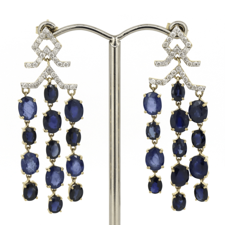 14K YELLOW GOLD, BLUE SAPPHIRE AND DIAMOND, CHANDELIER EARRINGS. The Earrings Feature, 26 Oval Cut, Medium-Deep Blue, Sapphires (14.55Ct Tsw, Slightly Included), Claw Set. Encompassing The Sapphires Are, 58 Round Brilliant Cut, Diamonds (0.60Ct Tdw, I-K Colour, P1-P2 Clarity), Claw Set. The Earrings Have Post Backs, With 14K Yellow Gold Butterfly Clasps. Valuations Provided by an Independent Third-Party Professional Not Directly Associated With Lloyds Auctions at AUD $$14,760.00This valuation has been conducted by an independent third-party professional. The valuation amount is an assessment by the issuing valuer and does not reflect the auction value of the item. Any inquiries regarding the valuation should be directed to the issuing valuer (refer to contact details on the certificate), as Lloyds Auctions has no affiliation or influence over the valuation, the valuer, or the stated amount. Condition: Good - Refer Images 0645839+1445