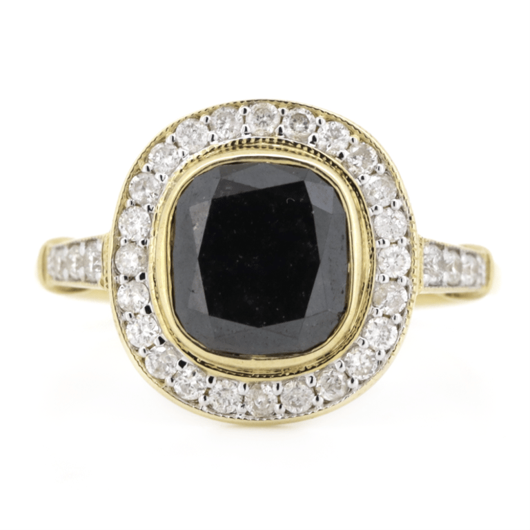 14K YELLOW GOLD, BLACK DIAMOND AND DIAMOND, HALO RING. The Centre Features, One Cushion Cut, Black, Diamond (2.43Ct, Enhanced, Opaque), Bezel Set. Surrounding The Centre In A Halo And Decorating The Shoulders Are, 30 Round Brilliant Cut, Diamonds (0.39Ct Tdw, J-K Colour, Si2-P2 Clarity), Bead Set. Ring Size O. Valuations Provided by an Independent Third-Party Professional Not Directly Associated With Lloyds Auctions at AUD $$10,850.00This valuation has been conducted by an independent third-party professional. The valuation amount is an assessment by the issuing valuer and does not reflect the auction value of the item. Any inquiries regarding the valuation should be directed to the issuing valuer (refer to contact details on the certificate), as Lloyds Auctions has no affiliation or influence over the valuation, the valuer, or the stated amount. Condition: Good - Refer Images 0645839+1417