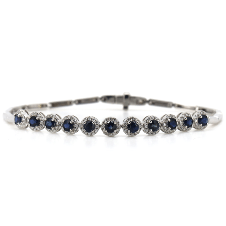 14K WHITE GOLD, BLUE SAPPHIRE AND DIAMOND, HALO BRACELET. The Centres Feature, 11 Round Cut, Medium/Medium Dark Royal Blue, Sapphires (1.89Ct Tsw, Eye Clean Clarity), Claw Set. Surrounding The Sapphires In Individual Halos Are, 132 Round Brilliant Cut, Diamonds (0.48Ct Tdw, G-H Colour, Si2-I2 Clarity), Claw Set. The Bracelet Has A Box Lock Clasp, With One Safety Latch. Bracelet Length Is 16.5Cm. Valuations Provided by an Independent Third-Party Professional Not Directly Associated With Lloyds Auctions at AUD $$14,370.00This valuation has been conducted by an independent third-party professional. The valuation amount is an assessment by the issuing valuer and does not reflect the auction value of the item. Any inquiries regarding the valuation should be directed to the issuing valuer (refer to contact details on the certificate), as Lloyds Auctions has no affiliation or influence over the valuation, the valuer, or the stated amount. Condition: Good - Refer Images 0645839+1413