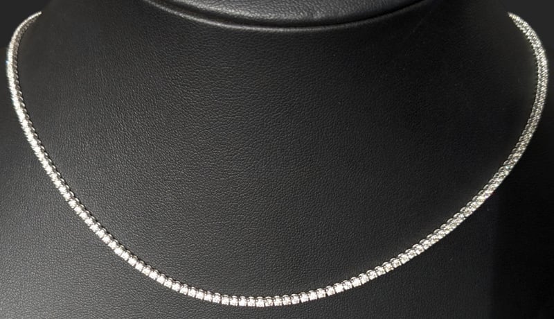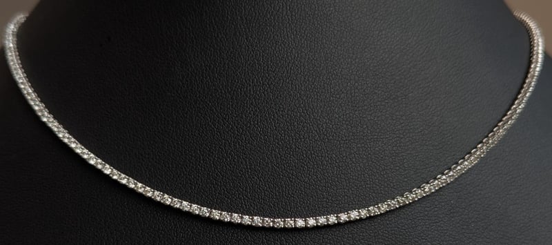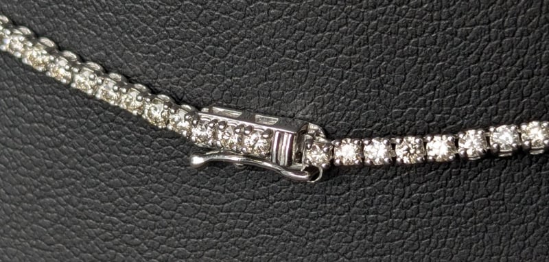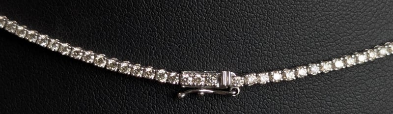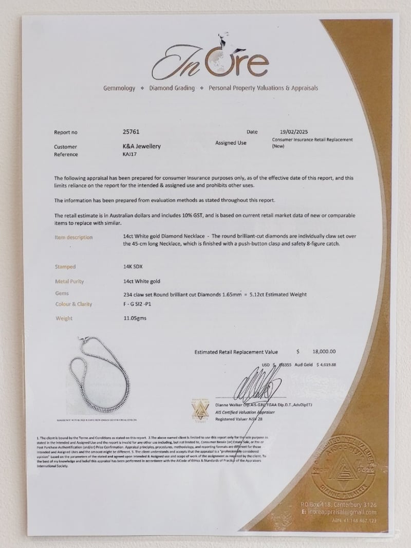 14K WHITE GOLD DIAMOND TENNIS NECKLACE The Round Brilliant Cut Diamonds Are Individually Claw Set Over The 45Cm Long Necklace, Which Is Finished With A Push Button Clasp And Safety 8-Figure Catch Total Item Weight: 11.05g Length: 45.00cm Markings: 14K Sdx Condition: Good - Refer To Images This valuation has been conducted by an independent third-party professional. The valuation amount is an assessment by the issuing valuer and does not reflect the auction value of the item. Any inquiries regarding the valuation should be directed to the issuing valuer (refer to contact details on the certificate), as Lloyds Auctions has no affiliation or influence over the valuation, the valuer, or the stated amount. Insurance Replacement Valuation Amount: $18,000.00 CROSSDOCK 162949+45