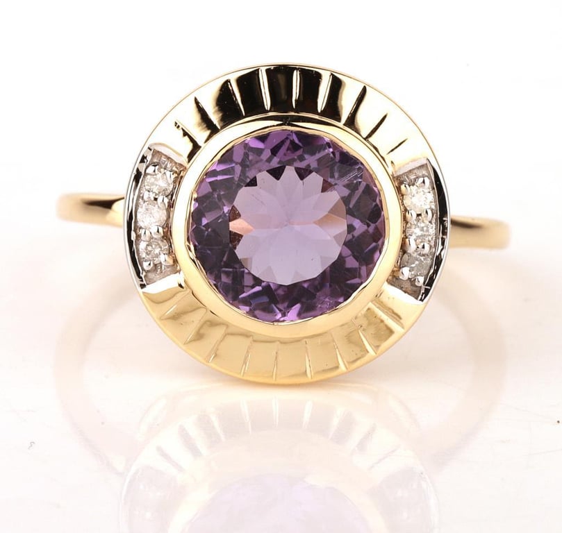 9CT YELLOW GOLD NATURAL AMETHYST & DIAMOND RING Weight Of The Item: 2.64 GFineness Of Metal(S): Yellow Gold 9KtThe Ring Consists Of (1) Round Brilliant Natural Amethyst. Surrounding The Main Stones Are Round Brilliant Cut Natural Diamonds.Antique StyleIdentification: Natural AmethystColor: PurpleShape: Round Brilliant CutNo. Of Stone: 1Dimension: 8 Mm X 8 Mm X 4.8 MmWeight: 1.8 CaratsCut: Very GoodIdentification: Natural DiamondShape: Round Brilliant CutWeight: 0.06 CtsCut: Excellent. Certificates Are Provided By Gemological Science International (Gsi), An Independent Third-Party Gemological Laboratory Based In The Usa And Recognised Among The Top 10 Gem Labs Globally Condition: Good - Refer Images 0488266+75