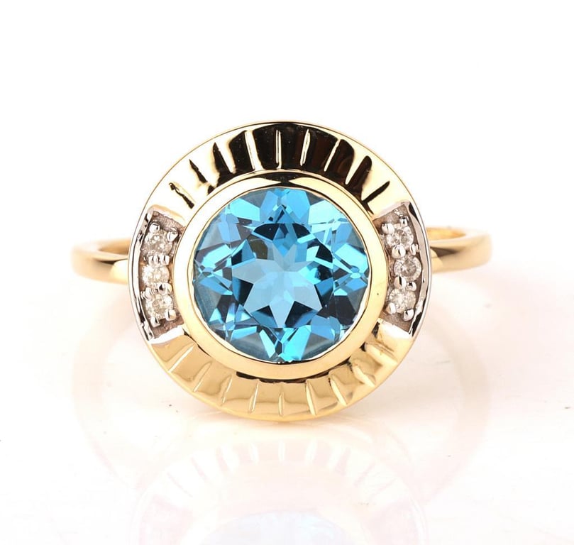 9CT YELLOW GOLD NATURAL SWISS BLUE TOPAZ & DIAMOND RING Weight Of The Item: 2.85 GFineness Of Metal(S): Yellow Gold 9KtThe Ring Consists Of (1) Round Brilliant Natural Swiss Blue Topaz. Surrounding The Main Stones Are Round Brilliant Cut Natural Diamonds.Antique StyleIdentification: Natural Swiss Blue TopazColor: BlueShape: Round Brilliant CutNo. Of Stone: 1Dimension: 8 Mm X 8 Mm X 4.8 MmWeight: 2.5 CaratsCut: Very GoodIdentification: Natural DiamondShape: Round Brilliant CutWeight: 0.06 CtsCut: Excellent. Certificates Are Provided By Gemological Science International (Gsi), An Independent Third-Party Gemological Laboratory Based In The Usa And Recognised Among The Top 10 Gem Labs Globally Condition: Good - Refer Images 0488266+80