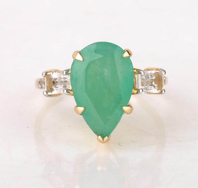 9CT YELLOW GOLD NATURAL EMERALD / NATURAL WHITE TOPAZ & DIAMOND RING Weight Of The Item: 2.59 GFineness Of Metal(S): Yellow Gold 9KtThe Ring Consists Of (1) Pear Brilliant Natural Emerald & (2) Baguette Step Cut White Topaz. Surrounding The Main Stones Are Round Brilliant Cut Natural Diamonds.Antique StyleIdentification: Natural Emerald / Natural White TopazColor: Green / WhiteShape: Pear Brilliant Cut / Baguette Faceted CutNo. Of Stone: 3Dimension: 12 Mm X 9 Mm X 7.2 MmWeight: 3.45 Carats / 0.7 CaratsCut: Very GoodIdentification: Natural DiamondShape: Round Brilliant CutWeight: 0.04 CtsCut: Excellent. Certificates Are Provided By Gemological Science International (Gsi), An Independent Third-Party Gemological Laboratory Based In The Usa And Recognised Among The Top 10 Gem Labs Globally Condition: Good - Refer Images 0488266+38