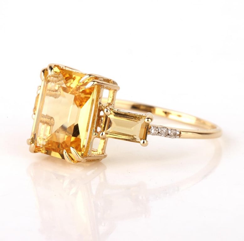 9CT YELLOW GOLD NATURAL CITRINE / NATURAL CITRINE & DIAMOND RING Weight Of The Item: 1.87 GFineness Of Metal(S): Yellow Gold 9KtThe Ring Consists Of (1) Octagon Brilliant Natural Citrine & (2) Octagon Step Cut Citrine. Surrounding The Main Stones Are Round Brilliant Cut Natural Diamonds.Antique StyleIdentification: Natural Citrine / Natural CitrineColor: Yellow / YellowShape: Octagon Brilliant Cut / Octagon Faceted CutNo. Of Stone: 3Dimension: 10 Mm X 8 Mm X 6 MmWeight: 2.8 Carats / 0 CaratsCut: Very GoodIdentification: Natural DiamondShape: Round Brilliant CutWeight: 0.03 CtsCut: Excellent. Certificates Are Provided By Gemological Science International (Gsi), An Independent Third-Party Gemological Laboratory Based In The Usa And Recognised Among The Top 10 Gem Labs Globally Condition: Good - Refer Images 0488266+47