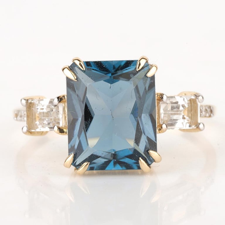 9CT YELLOW GOLD NATURAL LONDON BLUE TOPAZ / NATURAL WHITE TOPAZ & DIAMOND RING Weight Of The Item: 2.07 GFineness Of Metal(S): Yellow Gold 9KtThe Ring Consists Of (1) Octagon Brilliant Natural London Blue Topaz & (2) Octagon Step Cut White Topaz. Surrounding The Main Stones Are Round Brilliant Cut Natural Diamonds.Antique StyleIdentification: Natural London Blue Topaz / Natural White TopazColor: Blue / WhiteShape: Octagon Brilliant Cut / Octagon Faceted CutNo. Of Stone: 3Dimension: 10 Mm X 8 Mm X 6 MmWeight: 3.75 Carats / 0.65 CaratsCut: Very GoodIdentification: Natural DiamondShape: Round Brilliant CutWeight: 0.03 CtsCut: Excellent. Certificates Are Provided By Gemological Science International (Gsi), An Independent Third-Party Gemological Laboratory Based In The Usa And Recognised Among The Top 10 Gem Labs Globally Condition: Good - Refer Images 0488266+50