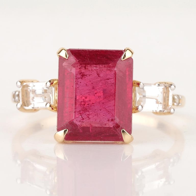 9CT YELLOW GOLD NATURAL RUBY / NATURAL WHITE TOPAZ & DIAMOND RING Weight Of The Item: 2.73 GFineness Of Metal(S): Yellow Gold 9KtThe Ring Consists Of (1) Octagon Brilliant Natural Ruby & (2) Baguette Step Cut White Topaz. Surrounding The Main Stones Are Round Brilliant Cut Natural Diamonds.Antique StyleIdentification: Natural Ruby / Natural White TopazColor: Red / WhiteShape: Octagon Brilliant Cut / Baguette Faceted CutNo. Of Stone: 3Dimension: 10 Mm X 8 Mm X 6 MmWeight: 5.25 Carats / 0.7 CaratsCut: Very GoodIdentification: Natural DiamondShape: Round Brilliant CutWeight: 0.04 CtsCut: Excellent. Certificates Are Provided By Gemological Science International (Gsi), An Independent Third-Party Gemological Laboratory Based In The Usa And Recognised Among The Top 10 Gem Labs Globally Condition: Good - Refer Images 0488266+64