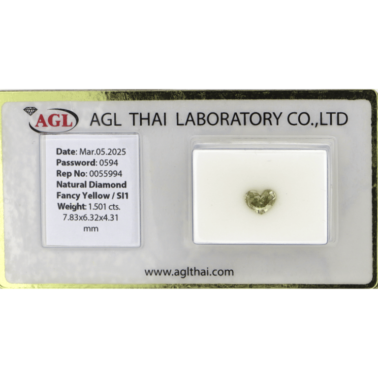 1.501CT CERTIFIED, NATURAL FANCY YELLOW DIAMOND,. Heart Brilliant Cut, Fancy Yellow, Si1 Clarity, Loose, Unset. Stone Comes Sealed With Agl Report: 0055994. Valuations Provided by an Independent Third-Party Professional Not Directly Associated With Lloyds Auctions at AUD $$20,000.00This valuation has been conducted by an independent third-party professional. The valuation amount is an assessment by the issuing valuer and does not reflect the auction value of the item. Any inquiries regarding the valuation should be directed to the issuing valuer (refer to contact details on the certificate), as Lloyds Auctions has no affiliation or influence over the valuation, the valuer, or the stated amount. Condition: Good - Refer Images 0645840+2117