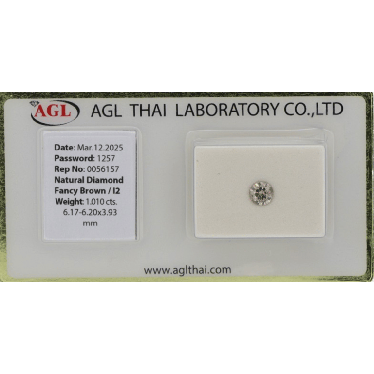 1.010CT CERTIFIED, NATURAL FANCY BROWN DIAMOND. Round Brilliant Cut, Fancy Brown, I2 Clarity, Loose, Unset. Stone Comes Sealed With Agl Report: 0056157. Valuations Provided by an Independent Third-Party Professional Not Directly Associated With Lloyds Auctions at AUD $$22,000.00This valuation has been conducted by an independent third-party professional. The valuation amount is an assessment by the issuing valuer and does not reflect the auction value of the item. Any inquiries regarding the valuation should be directed to the issuing valuer (refer to contact details on the certificate), as Lloyds Auctions has no affiliation or influence over the valuation, the valuer, or the stated amount. Condition: Good - Refer Images 0645840+2173