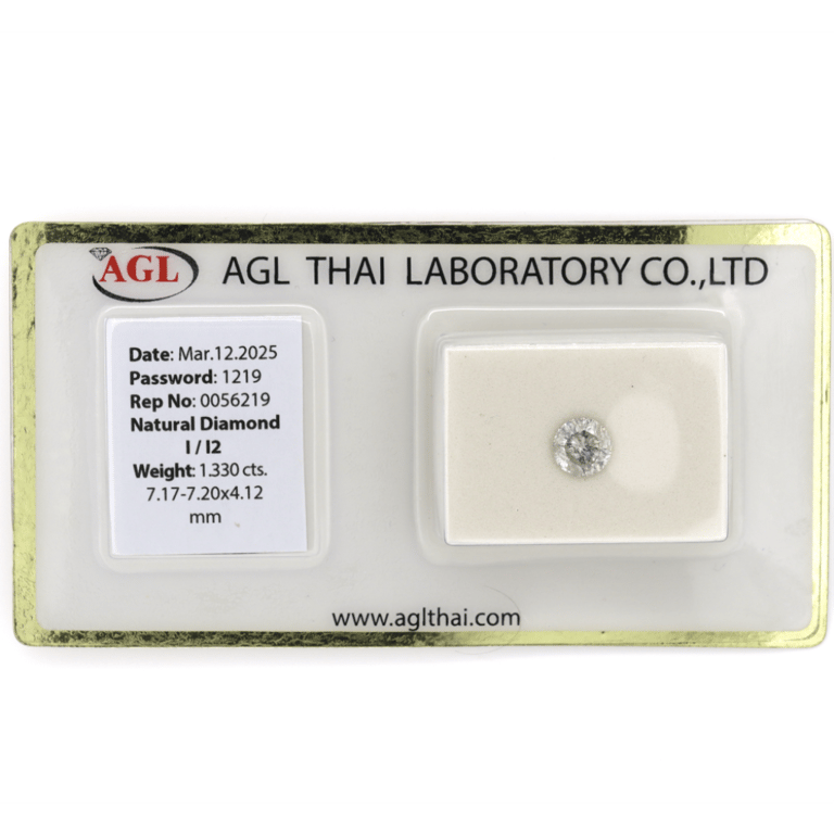 1.33CT CERTIFIED, NATURAL DIAMOND. Round Brilliant Cut, I Colour, I2 Clarity, Loose, Unset. Stone Comes Sealed With Agl Report: 0056219. Valuations Provided by an Independent Third-Party Professional Not Directly Associated With Lloyds Auctions at AUD $$12,500.00This valuation has been conducted by an independent third-party professional. The valuation amount is an assessment by the issuing valuer and does not reflect the auction value of the item. Any inquiries regarding the valuation should be directed to the issuing valuer (refer to contact details on the certificate), as Lloyds Auctions has no affiliation or influence over the valuation, the valuer, or the stated amount. Condition: Good - Refer Images 0645840+2104
