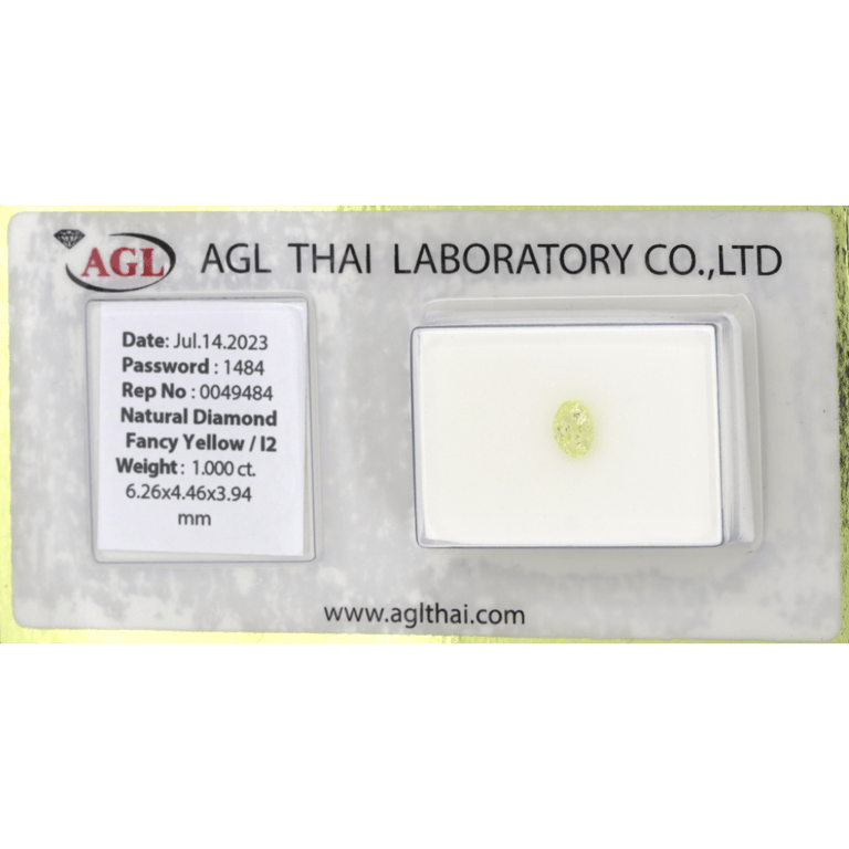 1.00CT CERTIFIED, NATURAL FANCY YELLOW DIAMOND. Oval Brilliant Cut, Fancy Yellow, I2 Clarity, Loose, Unset. Stone Comes Sealed With Agl Report: 0049484. Valuations Provided by an Independent Third-Party Professional Not Directly Associated With Lloyds Auctions at AUD $$10,500.00This valuation has been conducted by an independent third-party professional. The valuation amount is an assessment by the issuing valuer and does not reflect the auction value of the item. Any inquiries regarding the valuation should be directed to the issuing valuer (refer to contact details on the certificate), as Lloyds Auctions has no affiliation or influence over the valuation, the valuer, or the stated amount. Condition: Good - Refer Images 0645840+2182