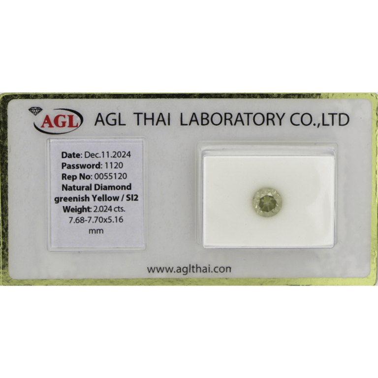 2.24CT CERTIFIED, NATURAL GREEN/YELLOW DIAMOND. Round Brilliant Cut, Greenish-Yellow, Si2 Clarity, Loose, Unset. Stone Comes Sealed With Agl Report: 0055120. Valuations Provided by an Independent Third-Party Professional Not Directly Associated With Lloyds Auctions at AUD $$15,600.00This valuation has been conducted by an independent third-party professional. The valuation amount is an assessment by the issuing valuer and does not reflect the auction value of the item. Any inquiries regarding the valuation should be directed to the issuing valuer (refer to contact details on the certificate), as Lloyds Auctions has no affiliation or influence over the valuation, the valuer, or the stated amount. Condition: Good - Refer Images 0645840+2157