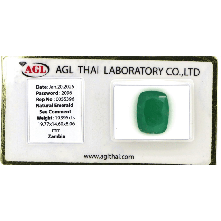 19.396CT CERTIFIED, NATURAL ZAMBIAN EMERALD. Cushion Brilliant Cut, Medium Deep Green, Minor Clarity Enhancement, Zambian Origin, Loose, Unset. Stone Comes Sealed With Agl Report: 0055396. Valuations Provided by an Independent Third-Party Professional Not Directly Associated With Lloyds Auctions at AUD $$28,050.00This valuation has been conducted by an independent third-party professional. The valuation amount is an assessment by the issuing valuer and does not reflect the auction value of the item. Any inquiries regarding the valuation should be directed to the issuing valuer (refer to contact details on the certificate), as Lloyds Auctions has no affiliation or influence over the valuation, the valuer, or the stated amount. Condition: Good - Refer Images 0645840+2122