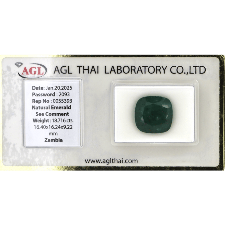 18.716CT CERTIFIED, NATURAL ZAMBIAN EMERALD. Cushion Cut, Deep Green, Minor Clarity Enhanced (Ee (O) Minor), Zambian Origin, Loose, Unset. Stone Comes Sealed With Agl Report: 0055393. Valuations Provided by an Independent Third-Party Professional Not Directly Associated With Lloyds Auctions at AUD $$27,860.00This valuation has been conducted by an independent third-party professional. The valuation amount is an assessment by the issuing valuer and does not reflect the auction value of the item. Any inquiries regarding the valuation should be directed to the issuing valuer (refer to contact details on the certificate), as Lloyds Auctions has no affiliation or influence over the valuation, the valuer, or the stated amount. Condition: Good - Refer Images 0645840+2179