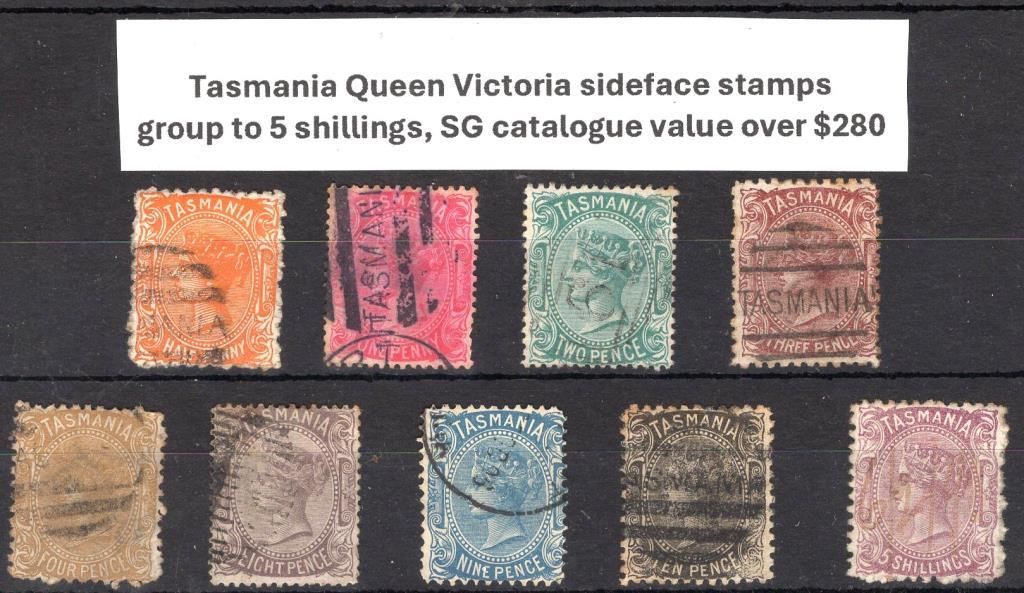 Tasmania Queen Victoria sideface stamps group to 5 shillings, 1860-1900 era