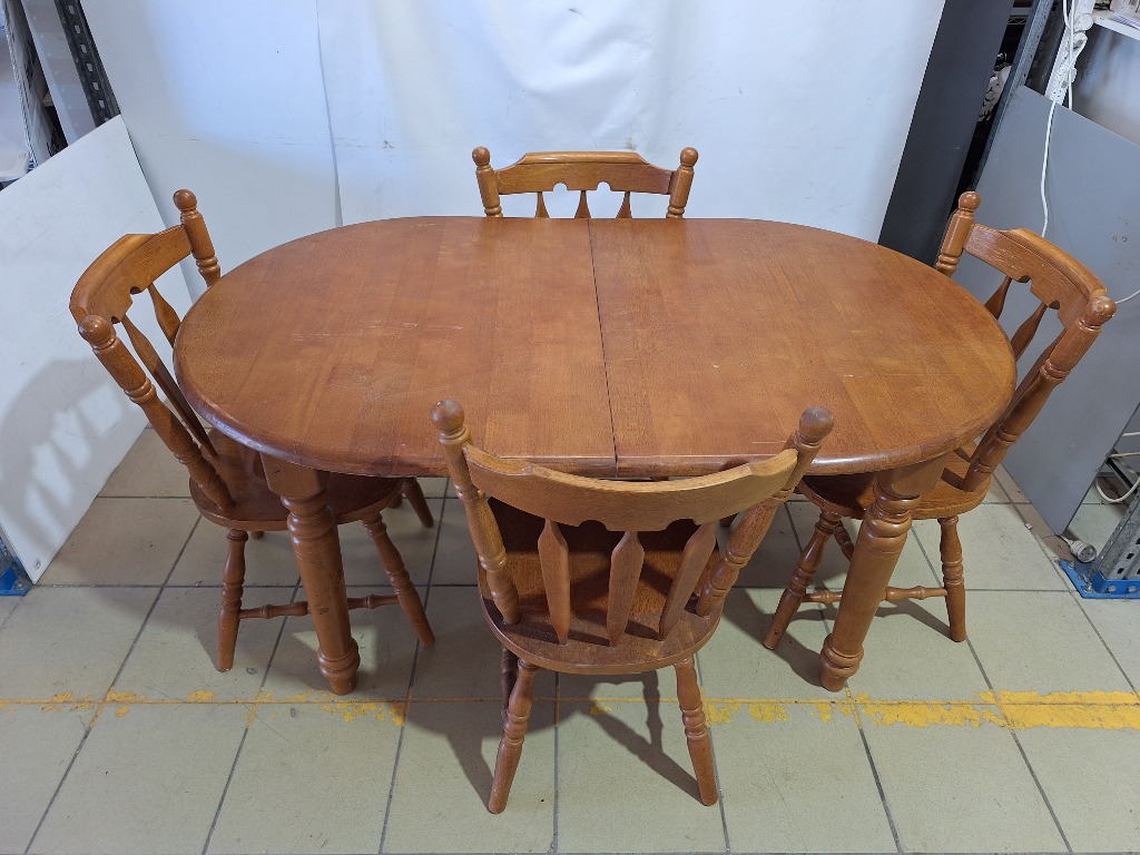 4 Seater Dining Table, Timber Style, Brown FinishDimensions Chairs H:90cm W:45cm D:43cmDimensions Table H:75cm W:90cm D:151cmSOLD AS LOT