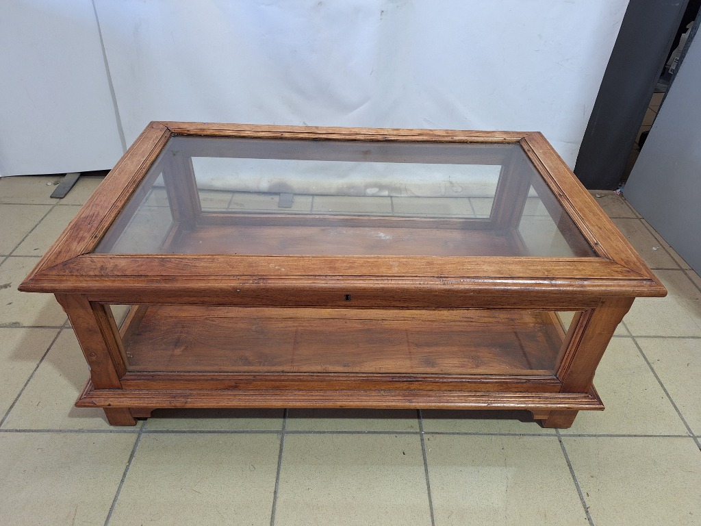 Coffee Table with a Glass Top & Display Case, Timber Style, Brown Finish Dimensions H:45cm W:70cm D:110