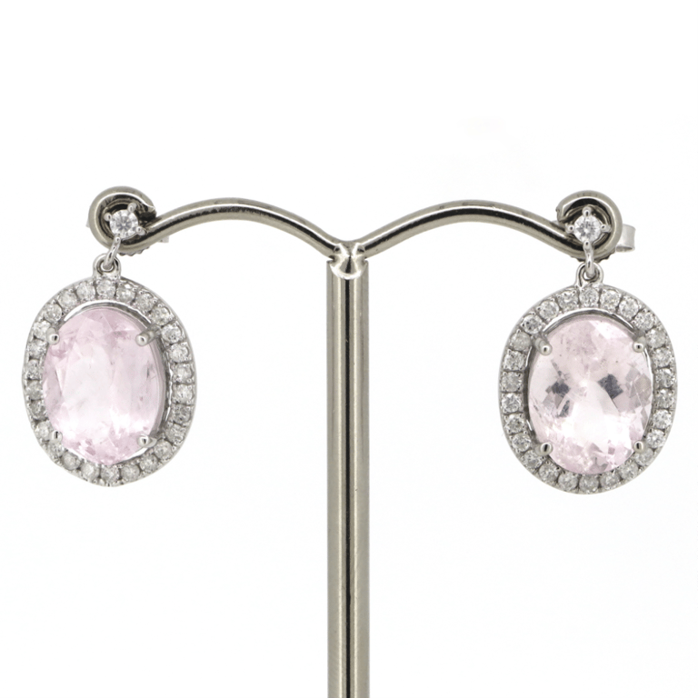 14K WHITE GOLD, MORGANITE AND DIAMOND, HALO DROP EARRINGS. The Design Features, 2 Oval Cut, Moderate Light Pink, Morganites (6.54Ct Tsw, Slightly Included), 4 Basket Claw Set. Surrounding The Centres In Halos And Decorating The Joins Are, 54 Round Brilliant Cut, Diamonds (0.65Ct Tdw, G-H Colour, Si1-Si2 Clarity), Claw Set. The Earrings Have Post Backs, With 14K White Gold Butterfly Clasps. Valuations Provided by an Independent Third-Party Professional Not Directly Associated With Lloyds Auctions at AUD $$10,000.00This valuation has been conducted by an independent third-party professional. The valuation amount is an assessment by the issuing valuer and does not reflect the auction value of the item. Any inquiries regarding the valuation should be directed to the issuing valuer (refer to contact details on the certificate), as Lloyds Auctions has no affiliation or influence over the valuation, the valuer, or the stated amount. Condition: Good - Refer Images 0645841+349