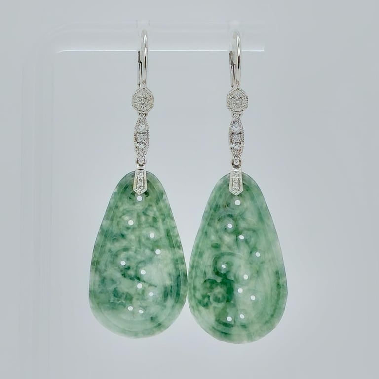 14CT WHITE GOLD NATURAL JADE AND DIAMOND ANTIQUE STYLE DROP EARRINGS. Featuring, 2 Carved Green And White Natural Jade (19.06Ct Tsw, Natural Inclusions), Drill Set, With 14 Round Brilliant Cut Diamonds (0.06Ct Tdw, F-G Colour, Vs2-Si1 Clarity), Bezel/Bead Set. Valuations Provided by an Independent Third-Party Professional Not Directly Associated With Lloyds Auctions at AUD $10900This valuation has been conducted by an independent third-party professional. The valuation amount is an assessment by the issuing valuer and does not reflect the auction value of the item. Any inquiries regarding the valuation should be directed to the issuing valuer (refer to contact details on the certificate), as Lloyds Auctions has no affiliation or influence over the valuation, the valuer, or the stated amount. Condition: Good - Refer Images 0586115+1286