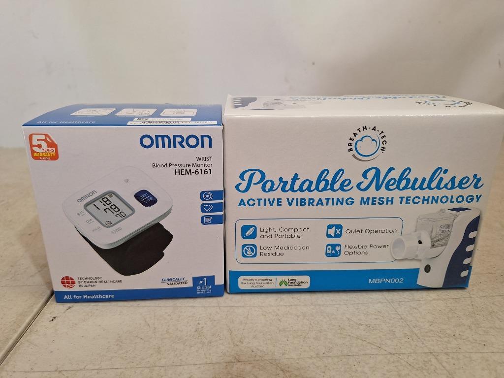 1 x OMRON wrist blood pressure monitor HEM-6161, NEW in box, 1 x BREATH-A-TECH portable nebuliser MBPN002, NEW in box