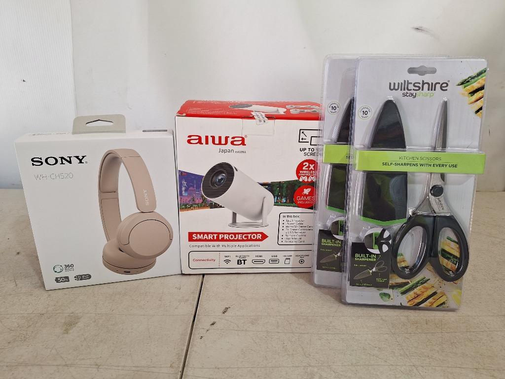 2 x WILTSHIRE Stay Sharp kitchen scissors self sharpens with every use, NEW factory sealed in packet, 1x AIWA Smart Led projector with dual game controllers up to 130' screen, NEW factory sealed in box, 1x SONY white Headphones ZH-CH520, NEW factory sealed in packet