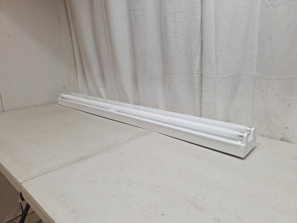 2 x Bare Batten T8 Fluorescent 2x26w, Fuzion Lighting, stylish design, large bore terminal blocks, powder coated hard wearing finish. Dimensions: H 8cm x W 123cm x D 13cm. BID PER BUNDLE OF 2