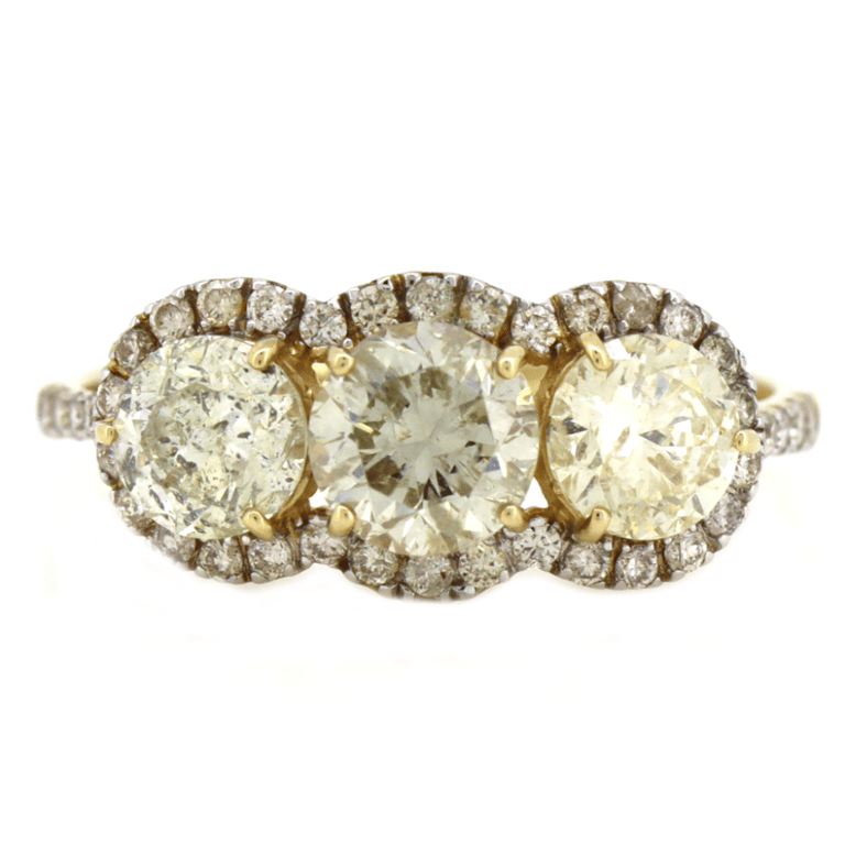 The Centre Features, 3 Round Brilliant Cut, Natural Fancy Yellow, Diamonds (1.80Ct Tdw, P1-P2 Clarity), 4 Claw Set. Encompassing The Centres In A Halo And Decorating The Band Are, 40 Round Brilliant Cut, Champagne, Diamonds (0.28Ct Tdw, J-L Colour, Si1-P1 Clarity), Claw Set. Ring Size N.
