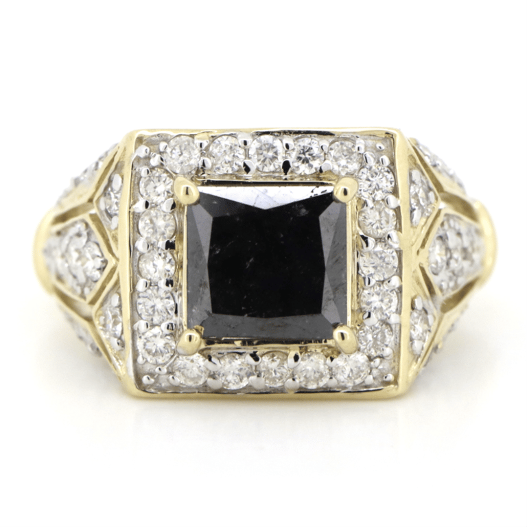 14K YELLOW GOLD, BLACK DIAMOND AND DIAMOND, HALO RING. The Centre Features, One Princess Cut, Black Diamond (1.67Ct, Opaque Clarity), 4 Claw Set. Encompassing The Centre Are, 48 Round Brilliant Cut, Diamonds (0.88Ct Tdw, H-J Colour, Si-I1 Clarity), Bead Set. Ring Size M 1/2. Valuations Provided by an Independent Third-Party Professional Not Directly Associated With Lloyds Auctions at AUD $$15,500.00This valuation has been conducted by an independent third-party professional. The valuation amount is an assessment by the issuing valuer and does not reflect the auction value of the item. Any inquiries regarding the valuation should be directed to the issuing valuer (refer to contact details on the certificate), as Lloyds Auctions has no affiliation or influence over the valuation, the valuer, or the stated amount. Condition: Good - Refer Images 0645844+5041