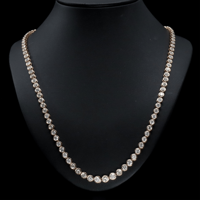 14K ROSE GOLD, 14.88CT TDW CHAMPAGNE DIAMOND, RIVIERA NECKLACE. The Design Features, 105 Round Brilliant Cut, Light Fancy Champagne, Diamonds (14.88Ct Tdw, P1+ Clarity), Bezel Set. The Necklace Features A Box Lock Clasp With A Hinged Safety Latch. Necklace Length Is 50Cm. Valuations Provided by an Independent Third-Party Professional Not Directly Associated With Lloyds Auctions at AUD $$71,600.00This valuation has been conducted by an independent third-party professional. The valuation amount is an assessment by the issuing valuer and does not reflect the auction value of the item. Any inquiries regarding the valuation should be directed to the issuing valuer (refer to contact details on the certificate), as Lloyds Auctions has no affiliation or influence over the valuation, the valuer, or the stated amount. Condition: Good - Refer Images 0645844+5069