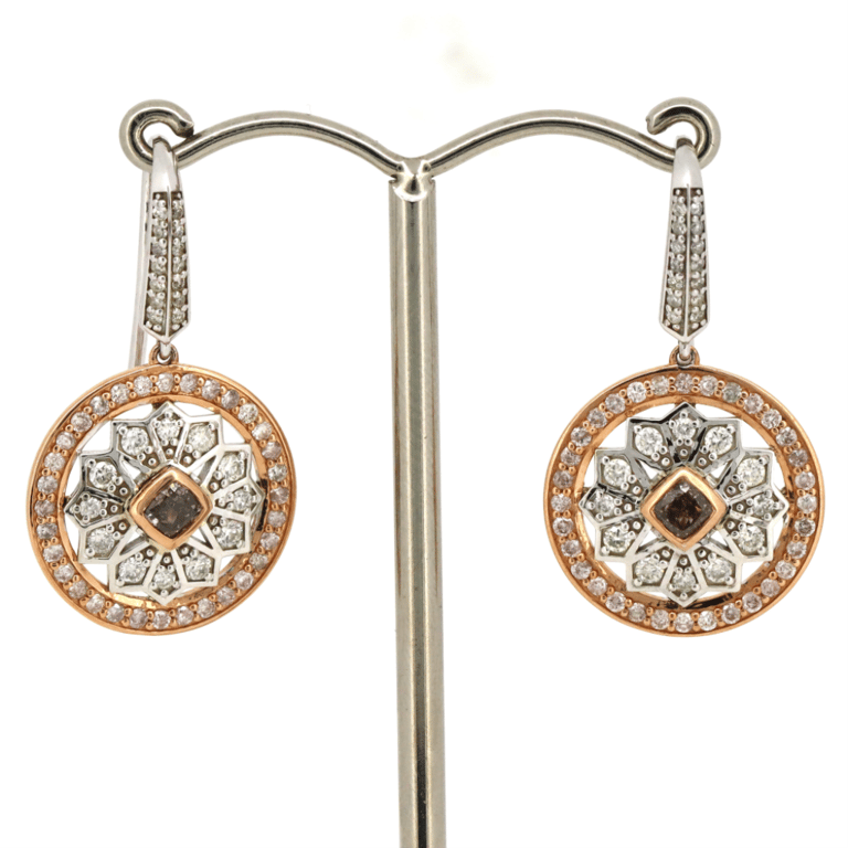 The Design Features, 2 Cushion Cut, Pink Champagne, Diamonds (0.48Ct Tdw, P1+ Clarity), Bezel Set In Rose Gold. Accompanying The Design Are, 116 Round Brilliant Cut, Diamonds (1.20Ct Tdw, H-K Colour, P1+ Clarity), Micro-Bead Set. The Earrings Have Shepherd Hooks.