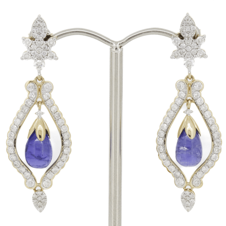 The Centers Feature, 2 Drop Cut, Medium-Dark Blue, Tanzanites (6.20Ct Tsw, Moderate Natural Inclusions), Partial Bezel Set. Embellishing The Drop Design Are, 120 Round Brilliant Cut, Diamonds (1.11Ct Tdw, H-K Colour, Si-I2 Clarity), Partial Bezel/Bead Set. The Earrings Have Post Backs, With 14K Yellow Gold Butterfly Clasps.