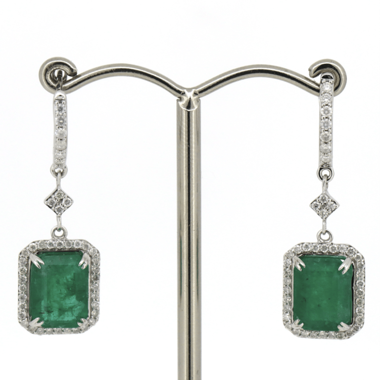 The Design Features, 2 Emerald Cut, Dark Moderate Green, Emeralds (5.28Ct Tsw, Moderate Eye Inclusions), Claw Set. Surrounding The Stones Are, 86 Round Brilliant Cut, Diamonds (0.54Ct Tdw, J-K Colour, Si2-I2 Clarity), Claw Setting. The Earrings Have Hoop Hinged Closures.