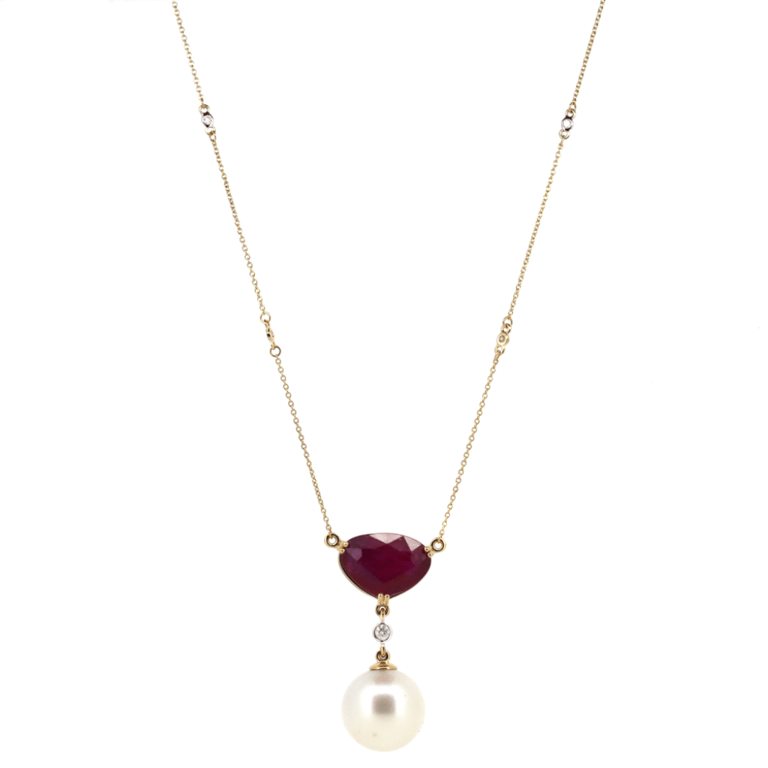 14K YELLOW GOLD, WHITE CULTURED SOUTH SEA PEARL, RUBY AND DIAMOND, NECKLACE. The Design Features, One Near Round, White With Silver Overtones Cultured Pearl (18.05Ct, 13.50Mm, Very Good Lustre), Cap Set. Encompassing The Design Is, One Free Form Cut, Deep Red, Ruby (7.85Ct, Moderately Included), Double Claw Set. Supporting The Design Is, 7 Round Brilliant Cut, Diamonds (0.15Ct Tdw, G-H Colour, Si1-Si2 Clarity), In Bezel Setting. The Necklace Features A Lobster Claw Clasp And Is 50Cm In Length. Valuations Provided by an Independent Third-Party Professional Not Directly Associated With Lloyds Auctions at AUD $$59,000.00This valuation has been conducted by an independent third-party professional. The valuation amount is an assessment by the issuing valuer and does not reflect the auction value of the item. Any inquiries regarding the valuation should be directed to the issuing valuer (refer to contact details on the certificate), as Lloyds Auctions has no affiliation or influence over the valuation, the valuer, or the stated amount. Condition: Good - Refer Images 0645844+5035