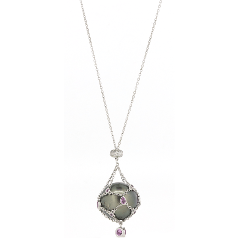 14K WHITE GOLD, GREY CULTURED TAHITIAN PEARL, PINK SAPPHIRE AND DIAMOND, CAGE NECKLACE.