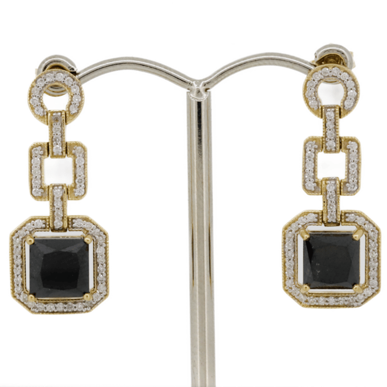 14K YELLOW GOLD, BLACK DIAMOND AND DIAMOND, DROP EARRINGS. The Design Features, 2 Princess Cut, Black, Diamonds (5.29Ct Tdw, Opaque), 4 Claw Set. Accompanying The Design Are, 110 Round Brilliant Cut, Diamonds (0.53Ct Tdw, G-H Colour, Si1-Si2 Clarity), Bead Set In White Gold. The Earrings Have Post Backs, With 14K Yellow Gold Butterfly Clasps. Valuations Provided by an Independent Third-Party Professional Not Directly Associated With Lloyds Auctions at AUD $$23,000.00This valuation has been conducted by an independent third-party professional. The valuation amount is an assessment by the issuing valuer and does not reflect the auction value of the item. Any inquiries regarding the valuation should be directed to the issuing valuer (refer to contact details on the certificate), as Lloyds Auctions has no affiliation or influence over the valuation, the valuer, or the stated amount. Condition: Good - Refer Images 0645844+5042