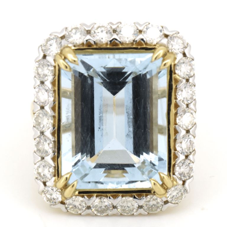 The Centre Features, One Emerald Mixed Cut, Light Blue, Aquamarine (11.31Ct, Slightly Included), Double 4 Claw Set. Encompassing The Centre In A Halo Are, 22 Round Brilliant, Cut, Diamonds (J-K Colour, Si2-I2 Clarity), Semi-Bezel Set. Ring Size O.