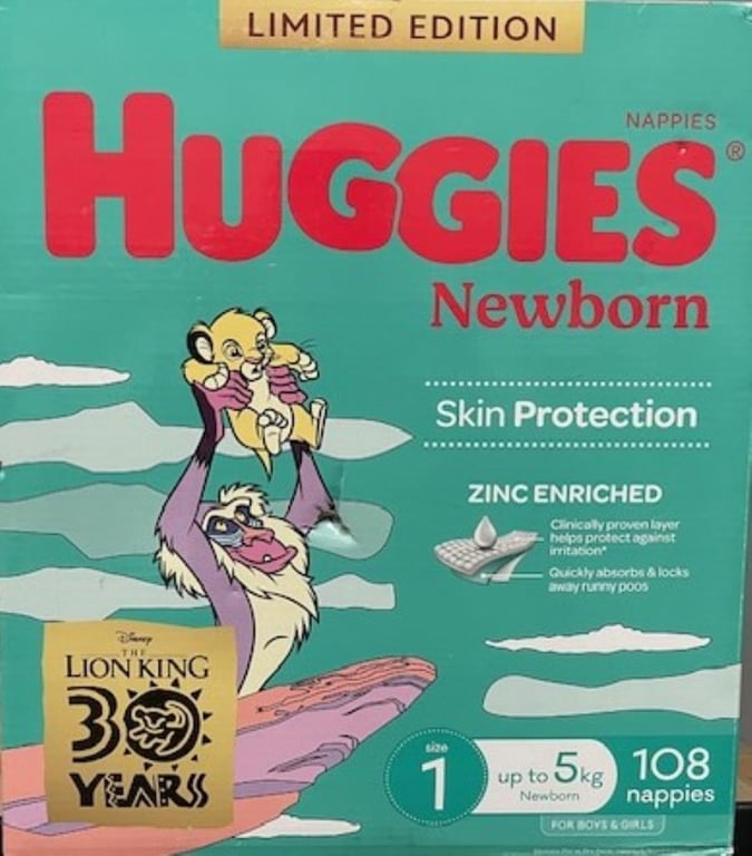 HUGGIES LIMITED EDITION LION KING- NEWBORN SKIN PROTECTION ZINC ENRICHED - SIZE 1- upto 5KG- 108 NAPPIES- Retail Return - Very Good condition - Original box