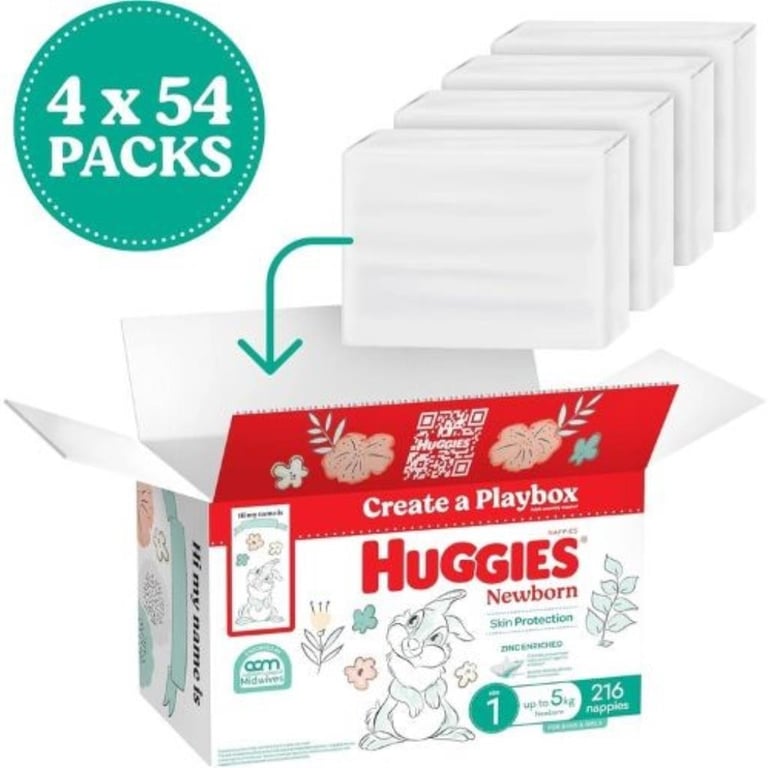 HUGGIES - SIZE 1- upto 5KG- 216 NAPPIES FOR BOYS & GIRLS- NEWBORN SKIN PROTECTION ZINC ENRICHED - Retail Return- As new condition - Original box- Sealed