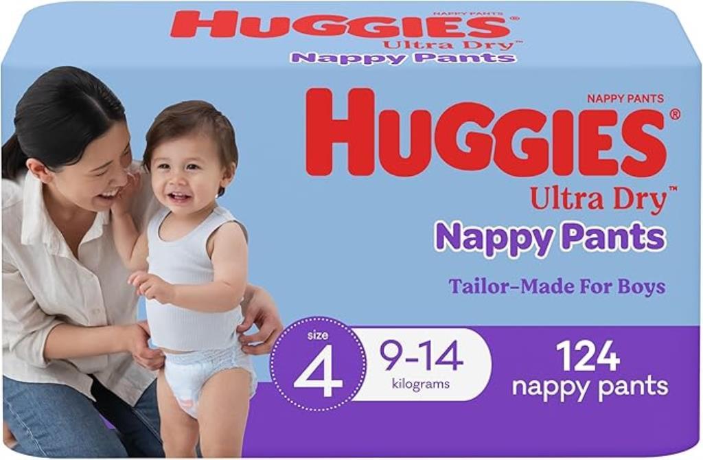 HUGGIES ULTRA DRY NAPPY PANTS Boy Size 4 (9-14kg) 124 Count (2 x 62 Pack)- Retail Return- As new condition- Original box