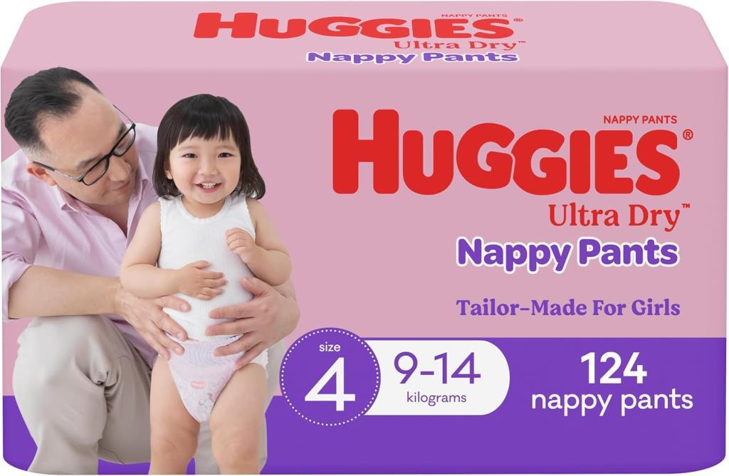 HUGGIES ULTRA DRY NAPPY PANTS Girl Size 4 (9-14kg) 124 Count (2 x 62 Pack)- Retail Return- Packets inside new condition- Original box good condition