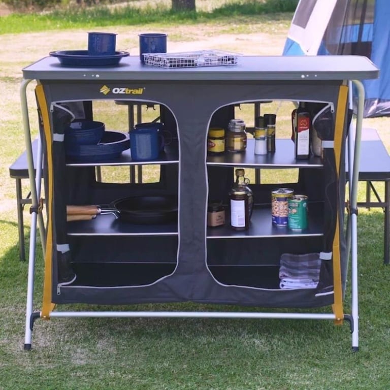 RRP $149 OZTRAIL 3 Shelf Double Deluxe Cupboard- The Deluxe Folding 3 Shelf Double Cupboard is designed for easy assembly and transportation. With a sturdy aluminum frame and durable Oxford polyester fabric skin, it provides a compact storage solution for your camping or outdoor needs.- Retail Return- Item inside presents with minor use- Original packaging- Excellent condition- Original box- untested