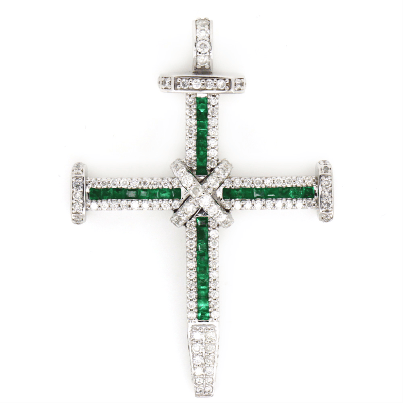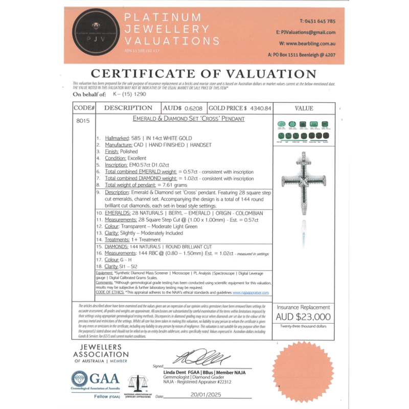 14K WHITE GOLD, EMERALD AND DIAMOND, CROSS PENDANT. The Design Features, 32 Square Step Cut, Emeralds (0.57Ct Tsw, Moderately Included), Channel Set. Accompanying The Design Are, 144 Round Brilliant Cut, Diamonds (1.02Ct Tdw, G-H Colour, Si1-Si2 Clarity), Bead Set. 14K White Gold, Emerald And Diamond, Cross Pendant. The Design Features, 32 Square Step Cut, Emeralds (0.57Ct Tsw, Moderately Included), Channel Set. Accompanying The Design Are, 144 Round Brilliant Cut, Diamonds (1.02Ct Tdw, G-H Colour, Si1-Si2 Clarity), Bead Set. Valuations Provided by an Independent Third-Party Professional Not Directly Associated With Lloyds Auctions at AUD $$23,000.00 This valuation has been conducted by an independent third-party professional. The valuation amount is an assessment by the issuing valuer and does not reflect the auction value of the item. Any inquiries regarding the valuation should be directed to the issuing valuer (refer to contact details on the certificate), as Lloyds Auctions has no affiliation or influence over the valuation, the valuer, or the stated amount. Condition: Good - Refer Images 0 645838+5340