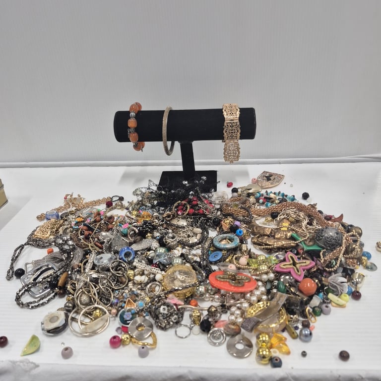 JAR OF MIXED BEADS, VINTAGE AND COSTUME JEWELLERY
