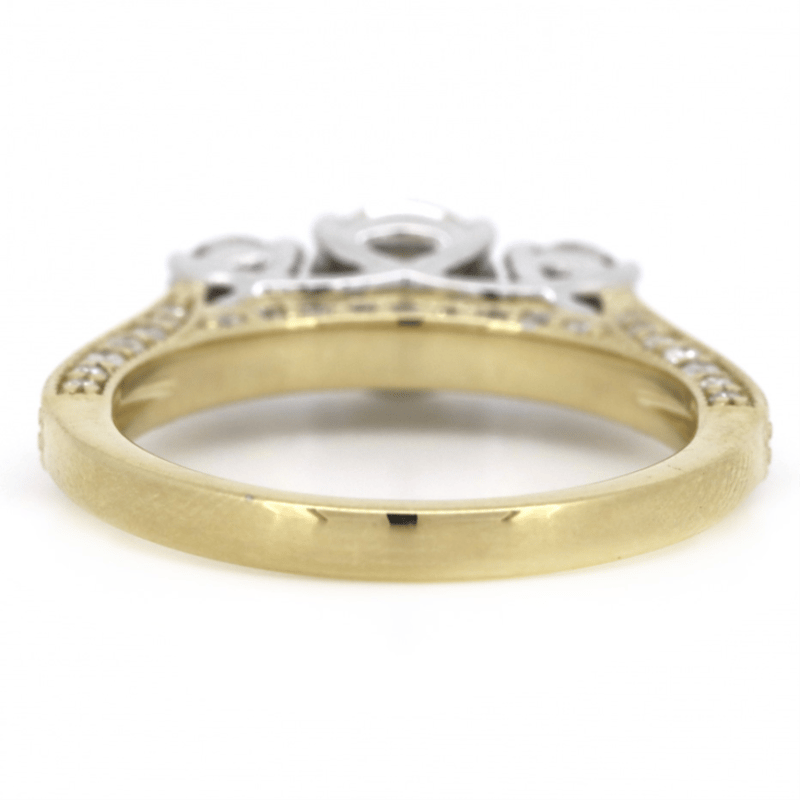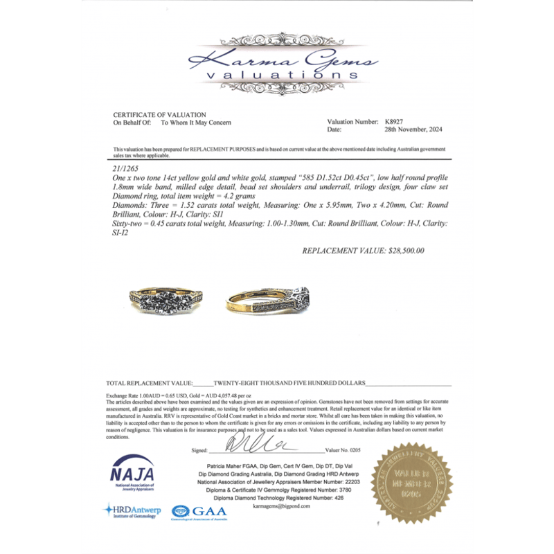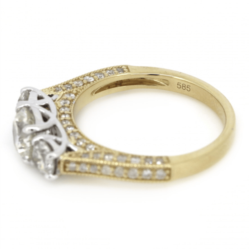 14K Yellow/White Gold And Diamond, Trilogy Ring. The Centre Features, 3 Round Brilliant Cut, Diamonds (1.52Ct Tdw, H-J Colour, Si1 Clarity), 4 Claw Set. Decorating The Band Are, 62 Round Brilliant Cut, Diamonds (0.45Ct Tdw, H-J Colour, Si-I2 Clarity), 4 Claw Set. Ring Size M.