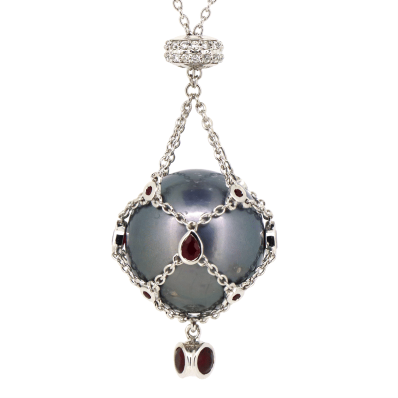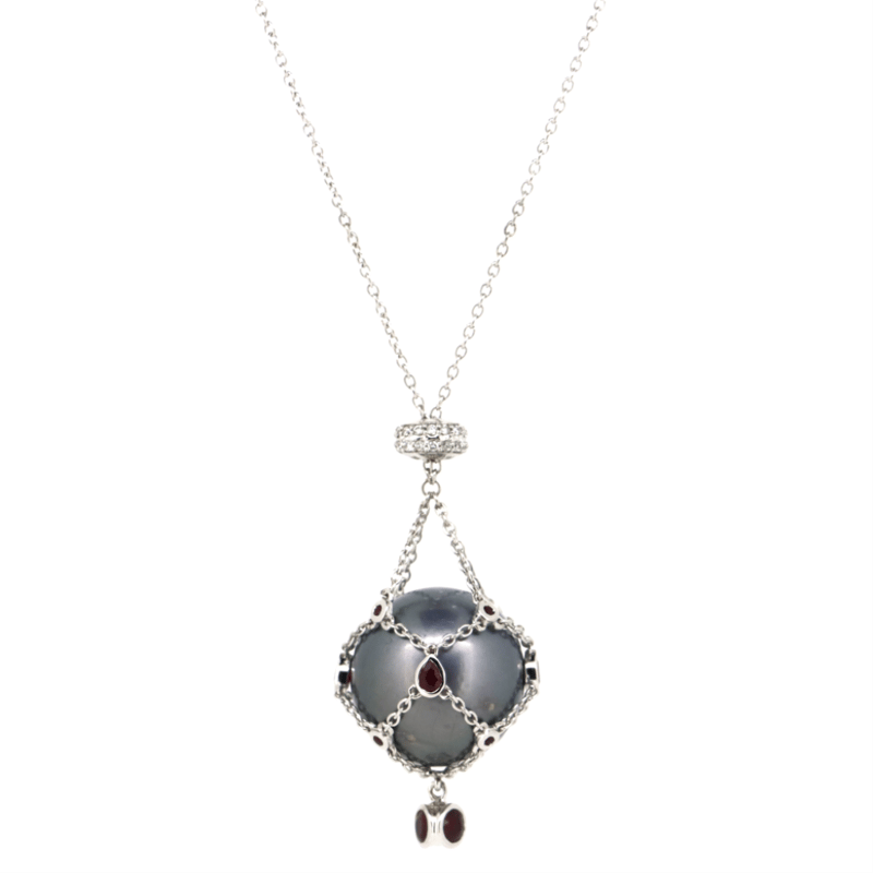 14K WHITE GOLD, GREY TAHITIAN PEARL, RUBY AND DIAMOND, CAGE NECKLACE.