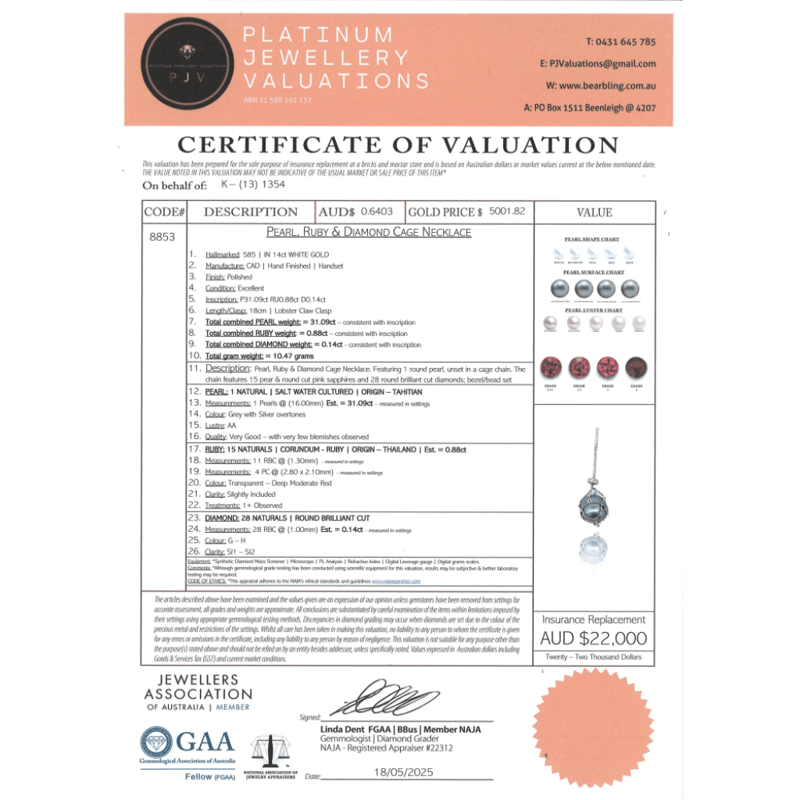 14K White Gold, Grey Tahitian Pearl, Ruby And Diamond, Cage Necklace. The Design Features, One Round, Grey With Silver Overtones, Cultured Tahitian Pearl (16.20Mm Size, Natural Growth Marks), Unset In A "Cage" Chain. The Chain Features, 15 Pear/Round Brilliant Cut, Deep Moderate Red, Rubies (0.88Ct Tsw, Slightly Included), And 28 Round Brilliant Cut, Diamonds (0.14Ct Tdw, G-H Colour, Si1-Si2 Clarity), Bezel/Bead Set. The Necklace Features A Lobster Claw Clasp Closure. Necklace Length Is 18Cm.